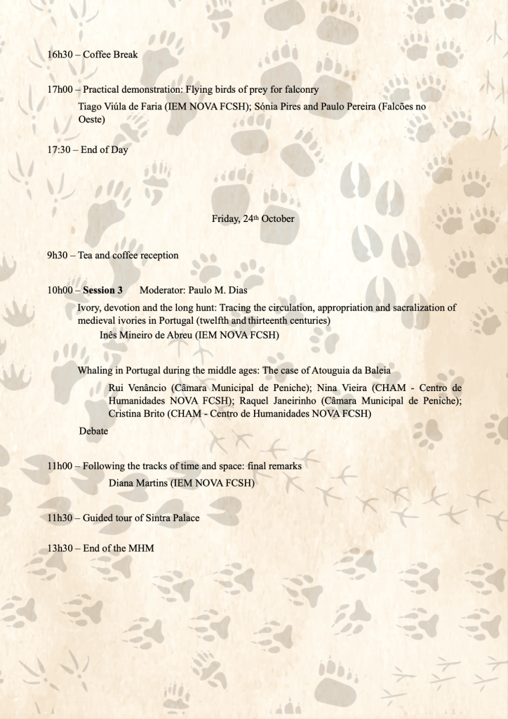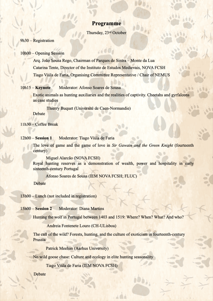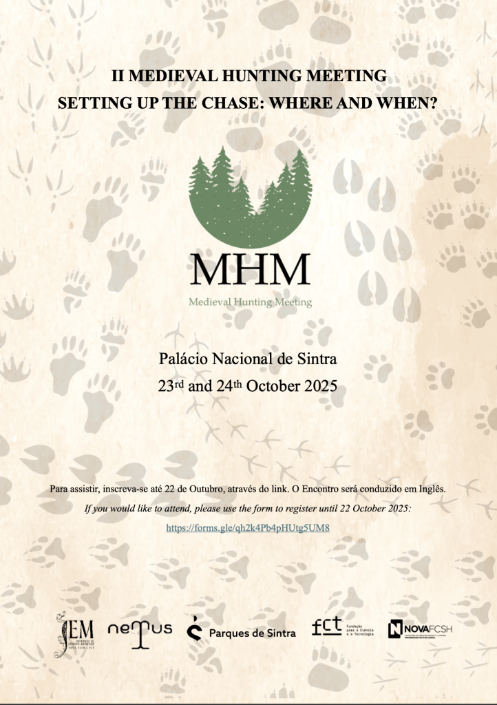 Preparations for the 2nd Medieval Hunting Meeting are well underway, the coming 23 and 24 October. Organised by NEMUS along with the Institute for Medieval Studies (IEM) at NOVA University Lisbon, this year the MHM enters into a partnership with Parques de Sintra, which has enabled the meeting to be held at the magnificent Sintra National Palace. One of Portugal’s emblematic medieval locations, it is deeply rooted in the history of hunting, making it the ideal setting for this year’s topic. ‘Setting up the Chase: Where and When?’ promises to continue scholary debate by bringing together international researchers from different disciplines, in keeping with the mission of NEMUS. The meeting (held in English) is open to anyone wishing to join the sessions and take part in the planned activities. Registration is free, but must be submitted by filling out this form until 22 October. We look forward to seeing you there.